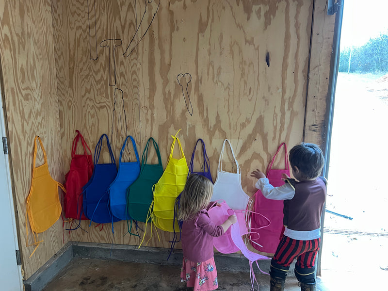 Our homestead workshop is arranged into six art stations, each offering a different medium, technique, and way of engaging with the natural world. Each workshop entails an art lesson teaching the fundamentals of art and design, technique, and the basics of each medium intertwined with nature and homesteading. Stations are refreshed to align with our seasonal and weekly nature themes. Children move freely and spend as much time as they'd like at each station, carrying the art techniques taught along the way.